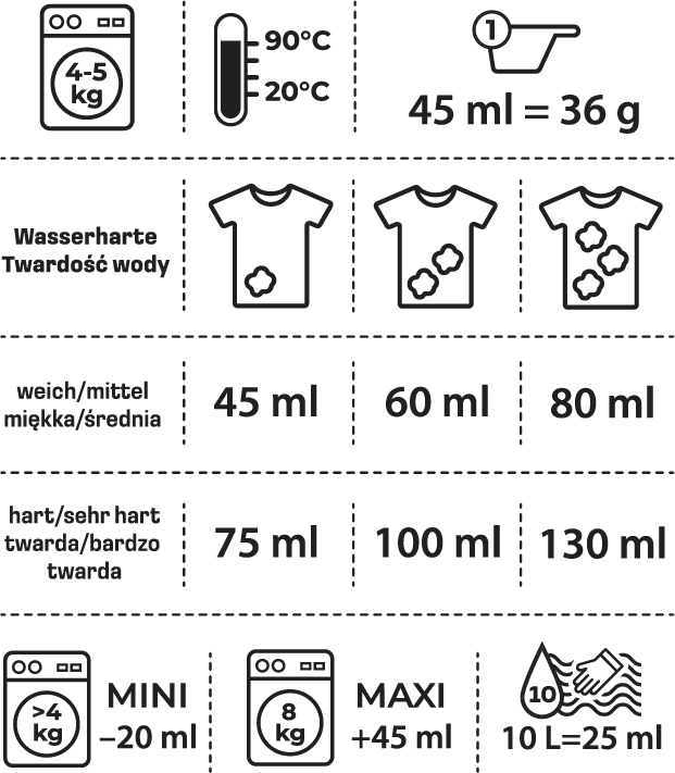 Abhängig von der Wasserhärte, dem Verschmutzungsgrad und der Beladung der Waschmaschine (siehe Dosierungstabelle) die entsprechende Waschmittelmenge abmessen. Beachten Sie die vom Maschinenhersteller empfohlene Beladungsmenge. Nicht geeignet für Wolle und Seide. Beachten Sie die Pflegehinweise auf den Textilien. Sortieren Sie Ihre Wäsche nach Farbe, Verschmutzungsgrad und Waschtemperatur.